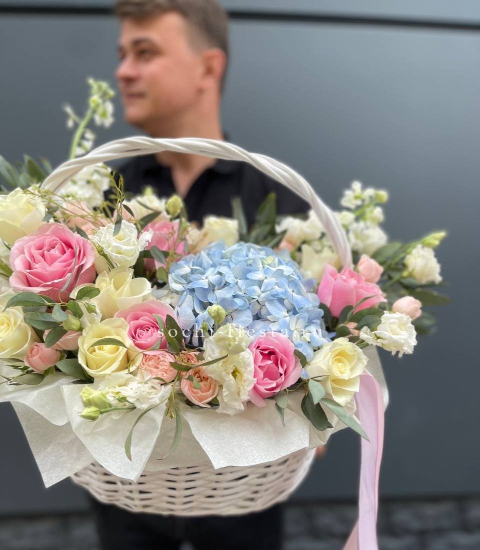 Пышные шапки гортензии и яркие бомбастики собраны в корзину с плавными переходами оттенков. Композиция держит форму и создаёт объёмное цветовое пятно в любом пространстве.