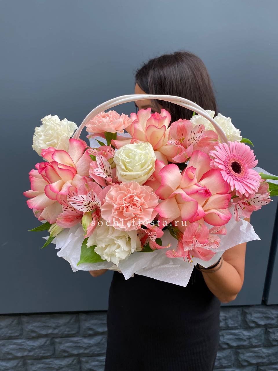розы нежных оттенков (по возможности джумилия),эустома, диантусы,  гербера, альстромерии,  лента, корзина