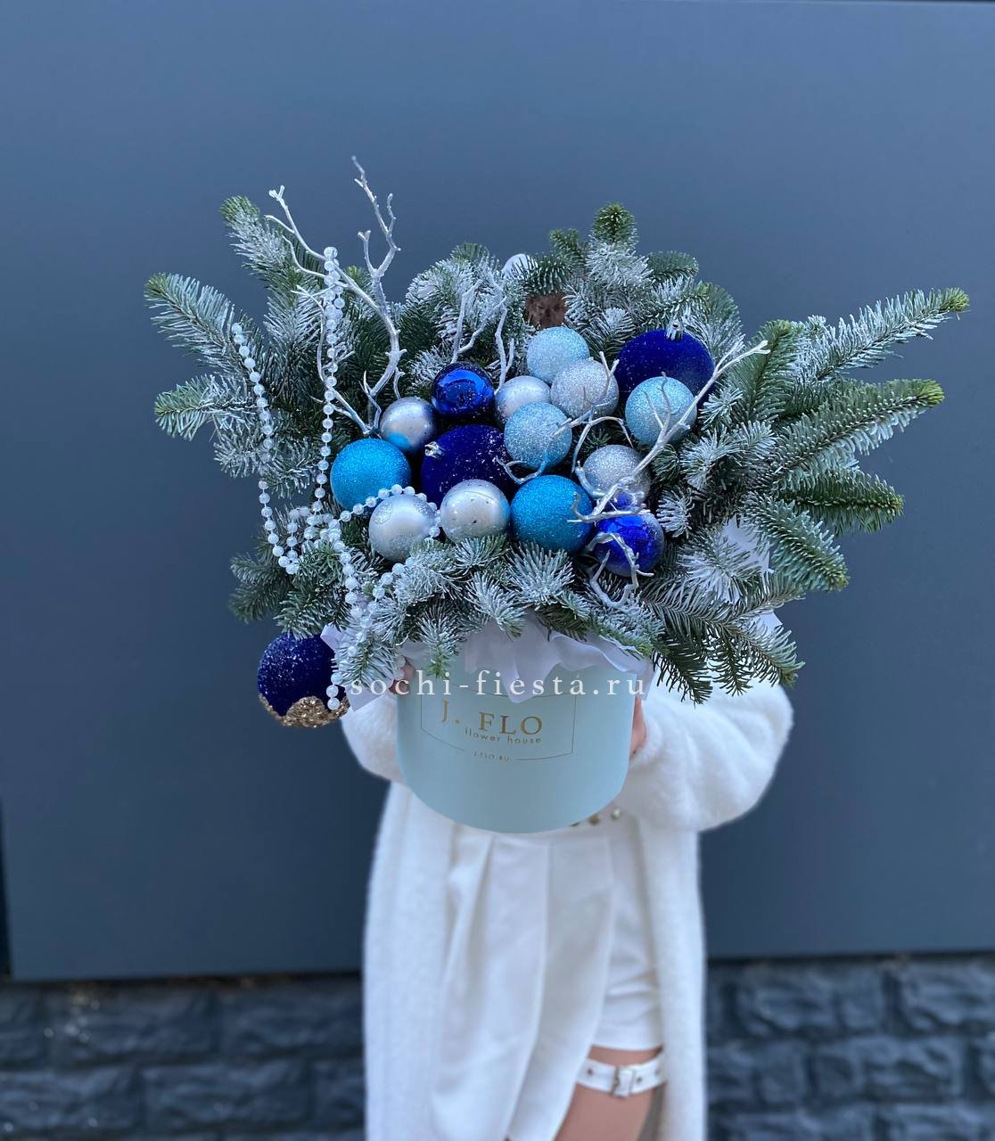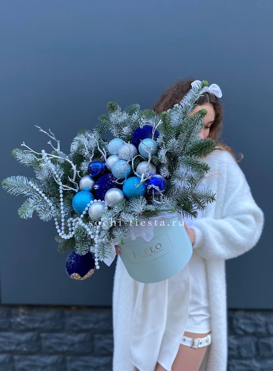 Холодные оттенки игрушек и декора переплетаются с насыщенной зеленью нобилиса. Композиция построена на игре глубоких и светлых тонов без лишней пестроты. Цилиндр задает четкую геометрию всей конструкции.