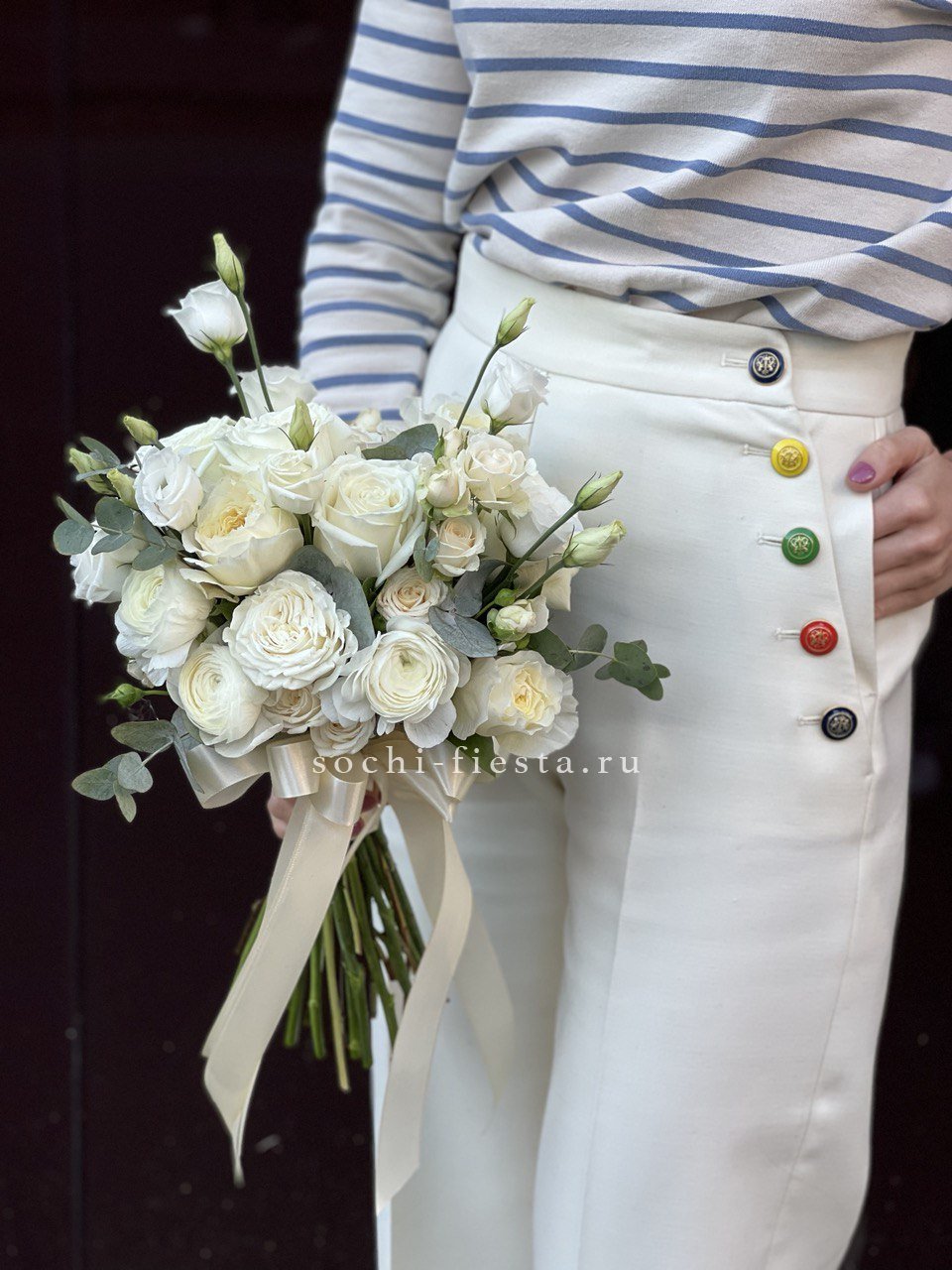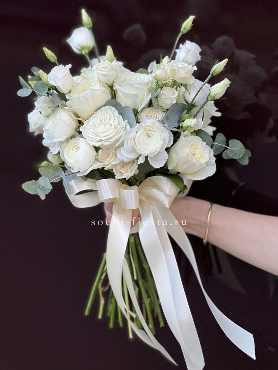 эустома, одноголовые розы, сопутствующие элементы (мелкие цветы или бруния в зависимости от сезона), эвкалипт, лента.