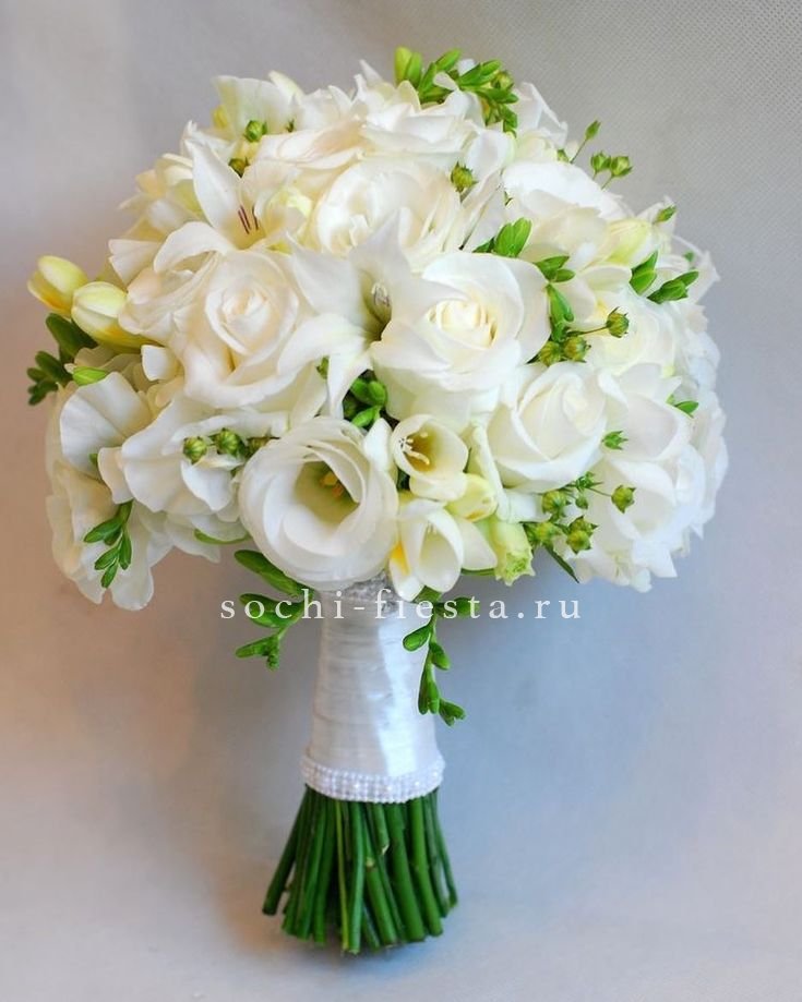 Белоснежная композиция с махровыми соцветиями эустомы и классическими розами. Сезонные детали и зелень образуют естественный рисунок без лишней строгости.