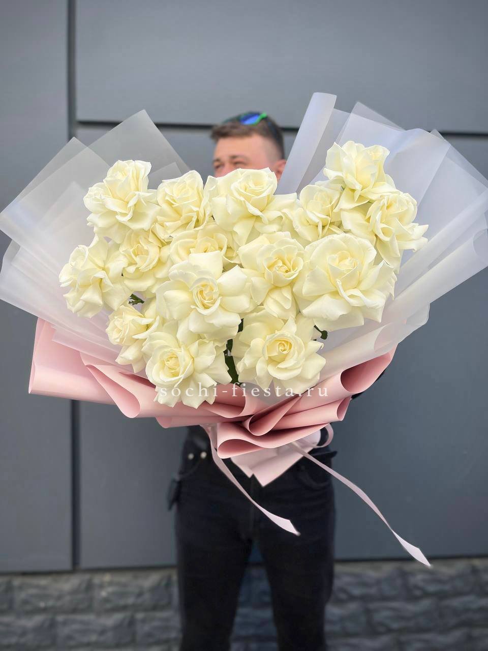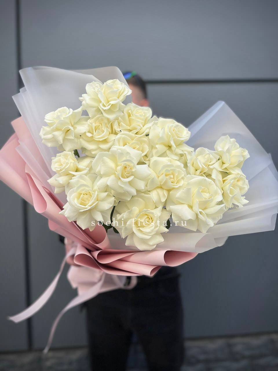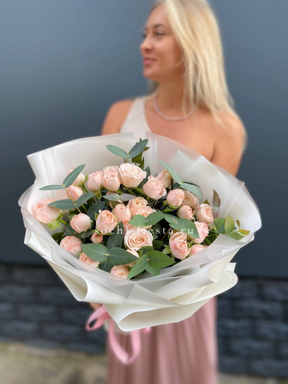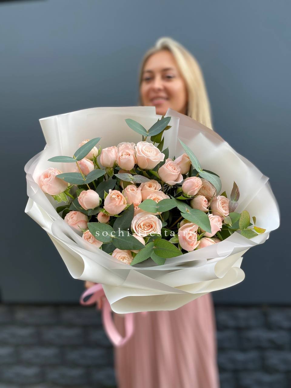 Семь пионовидных роз образуют компактный букет с мягкими линиями и спокойным ритмом. Ветви эвкалипта добавляют воздушности и завершают композицию.