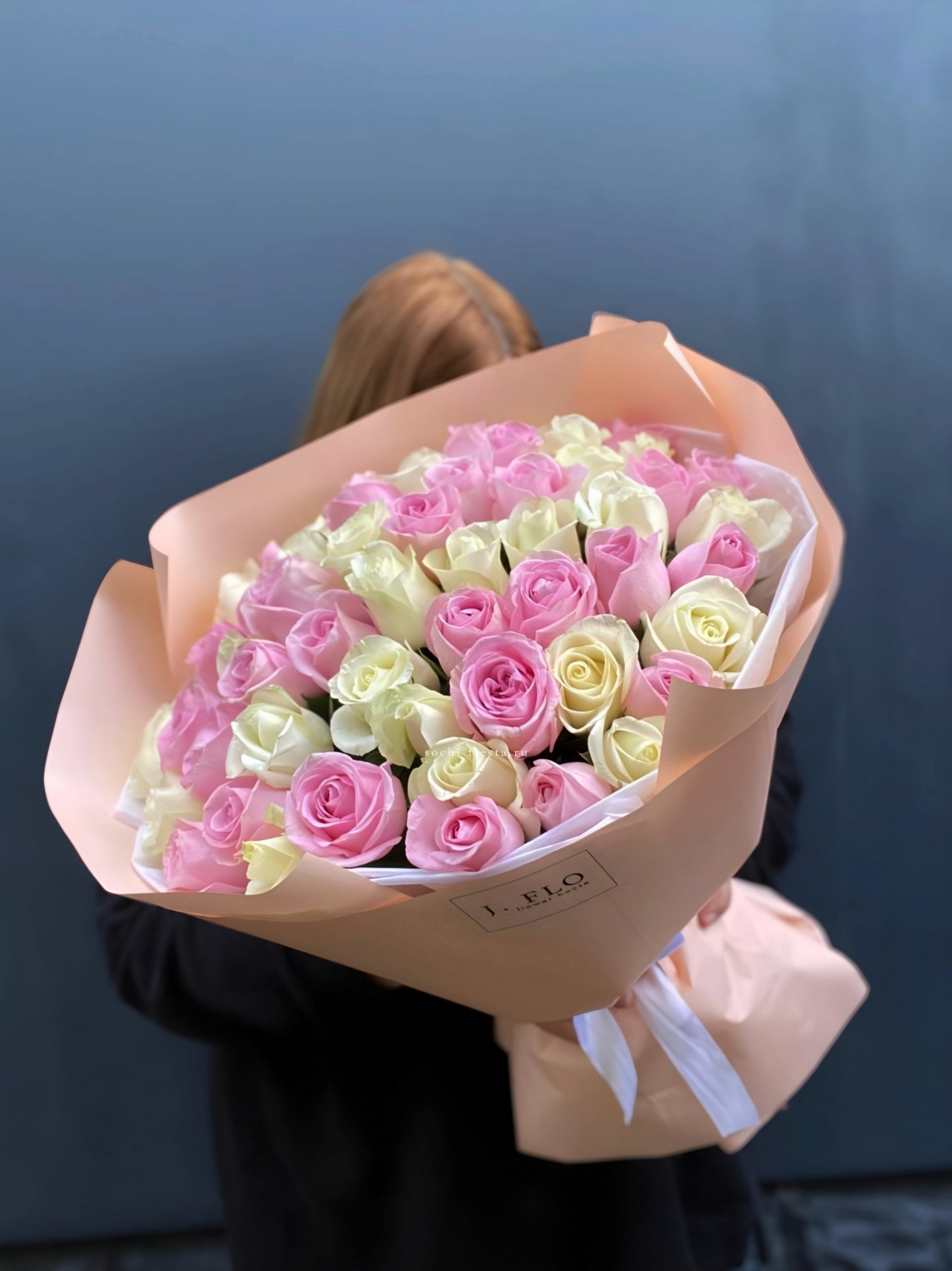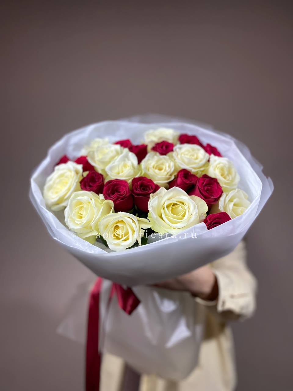 Тридцать пять роз в красно-белой гамме складываются в гармоничную форму с живым ритмом. Бутоны разной степени раскрытия добавляют визуальной глубины всей композиции.