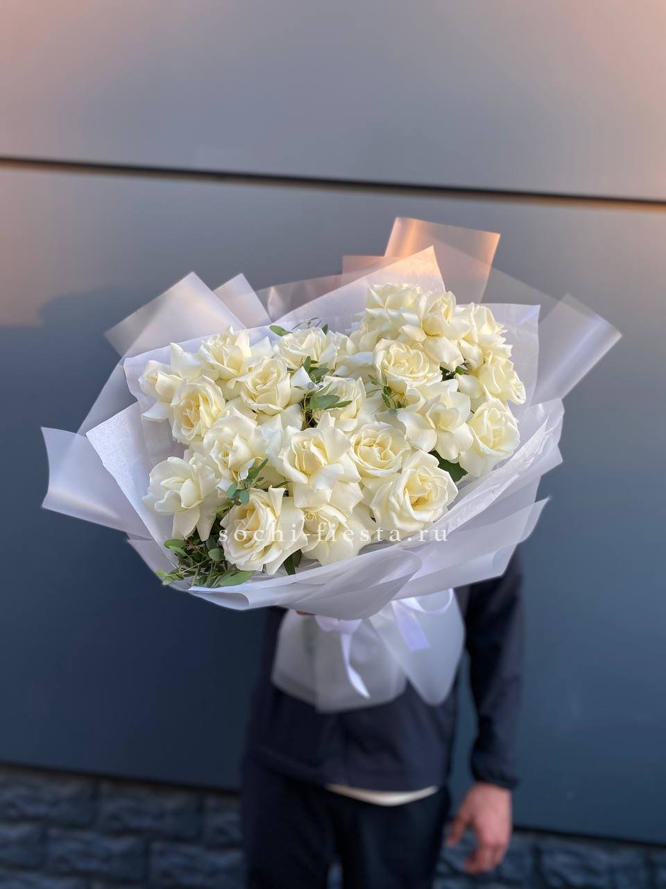 19 белых роз, лента, крафт.