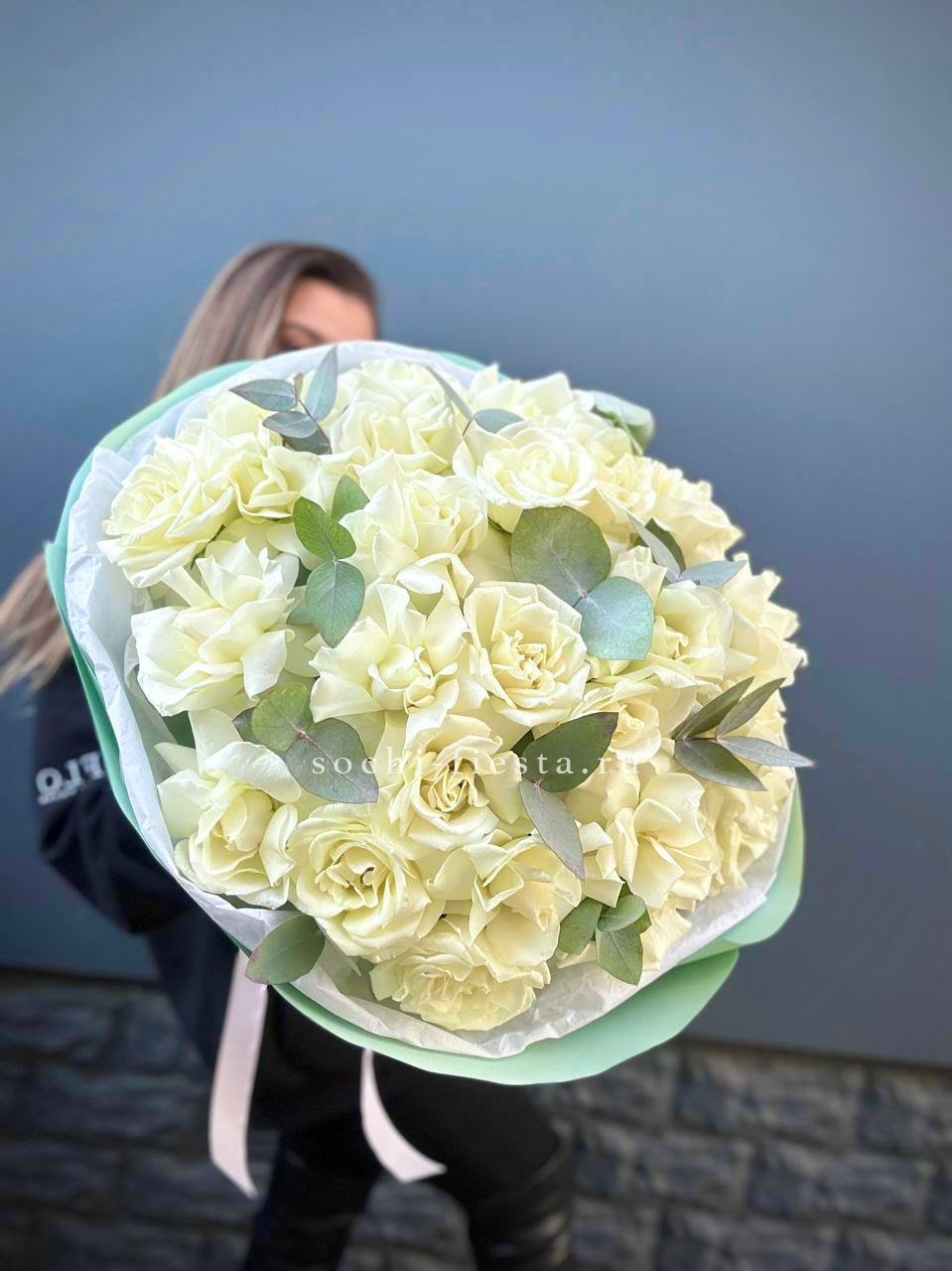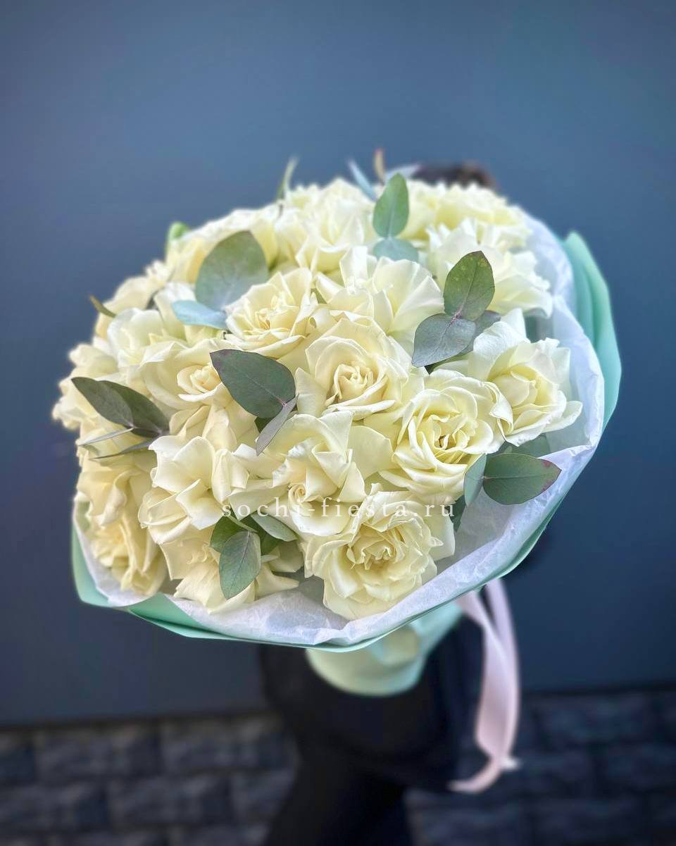 Белоснежные лепестки создают ощущение света и простора. Двадцать один бутон образует воздушную композицию с мягким переходом оттенков. Букет дарит момент тишины и покоя.