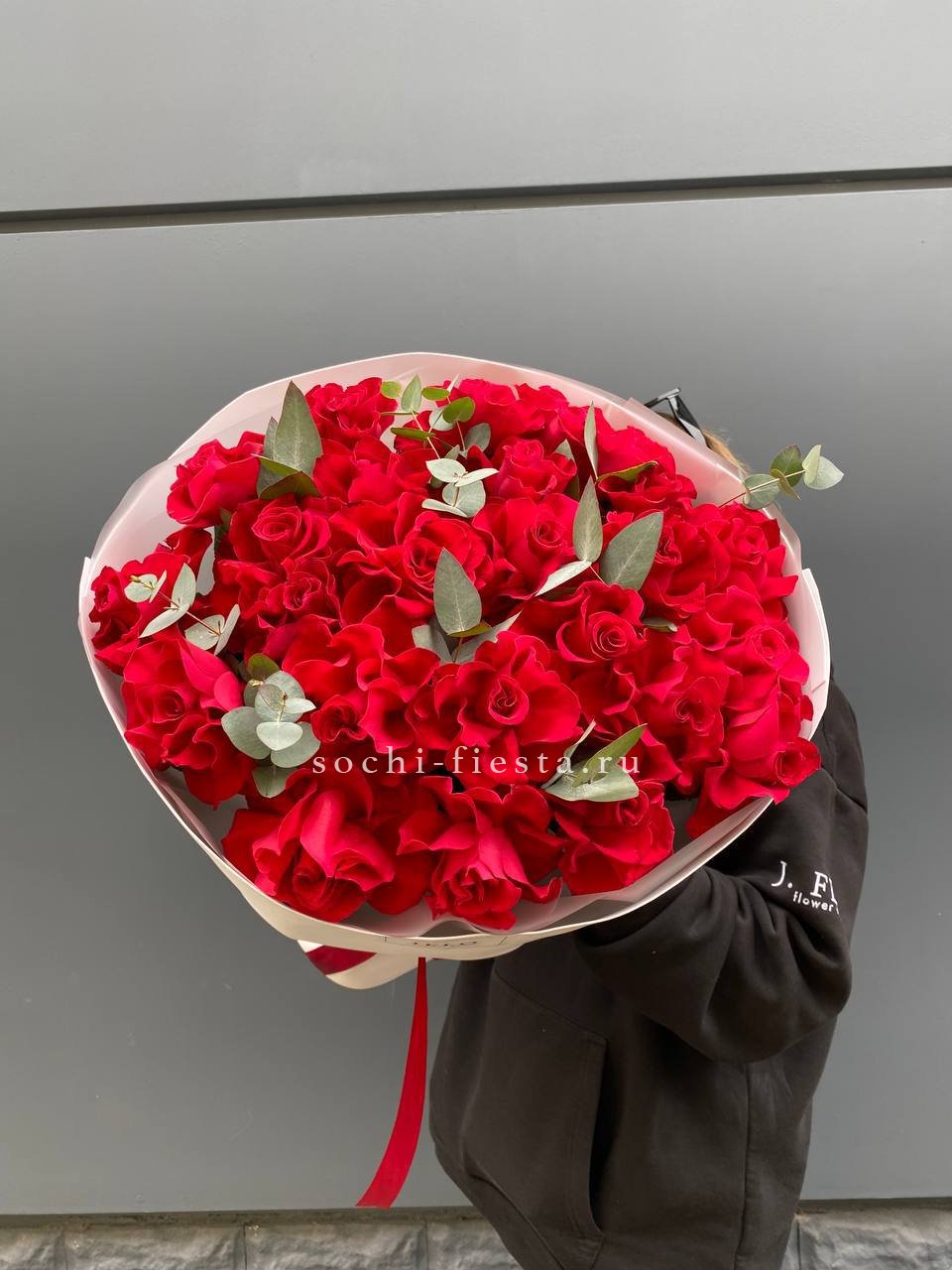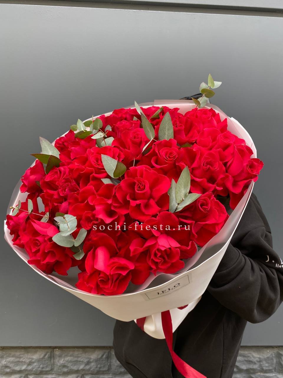 Полсотни алых бутонов образуют объемную композицию с выразительным присутствием. Классическая форма сохраняет четкость линий и долго радует свежестью.
