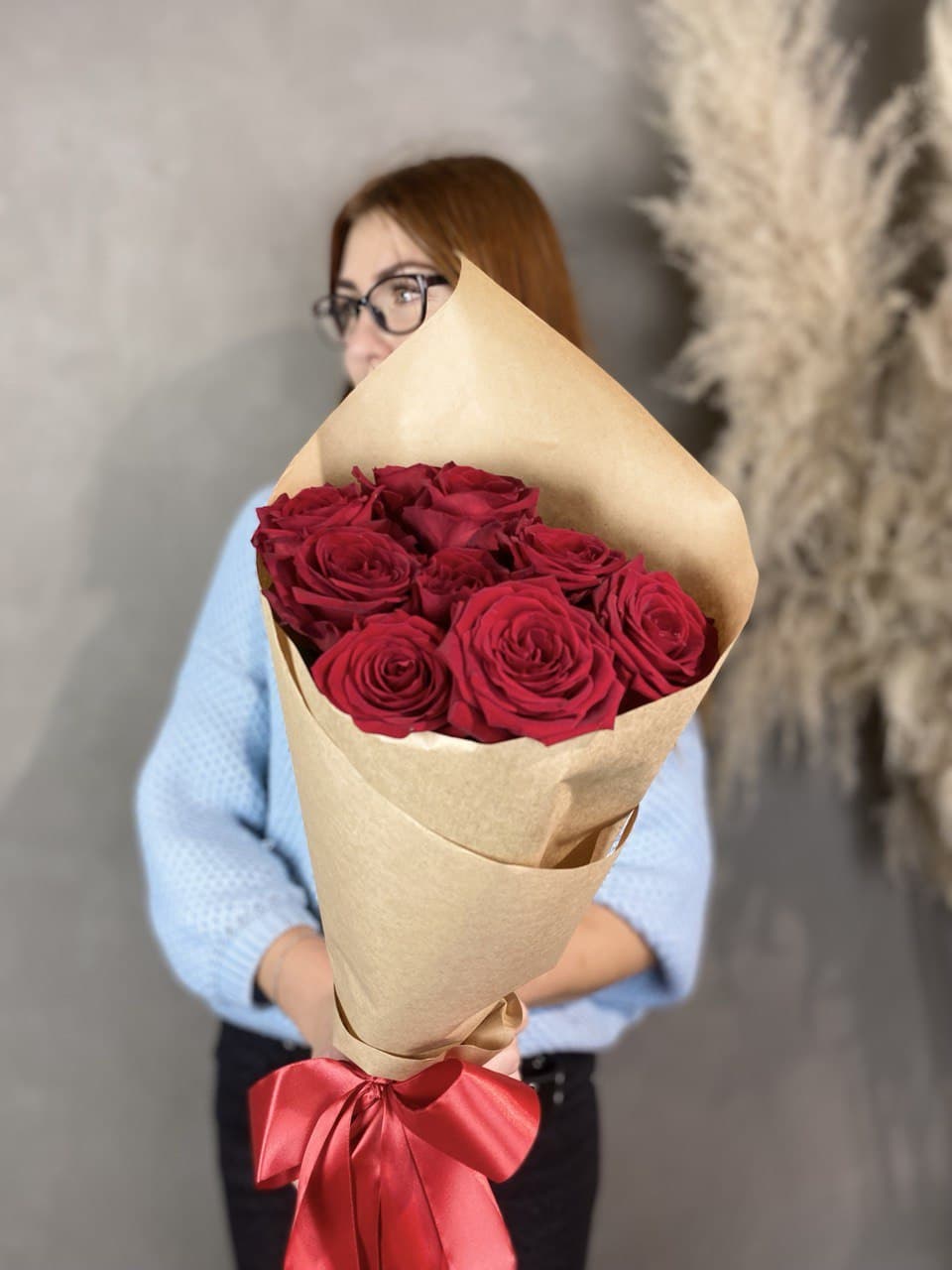 Девять красных бутонов в обрамлении свежего эвкалипта и крафтовой обёртки. Лаконичная сборка для тех, кто ценит простоту и выразительность цвета без лишних деталей.