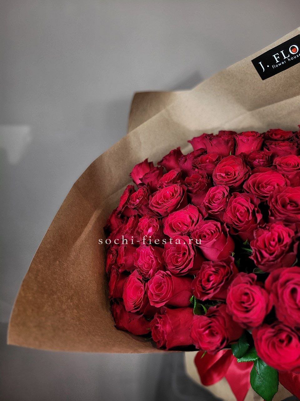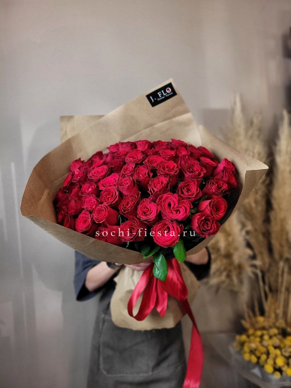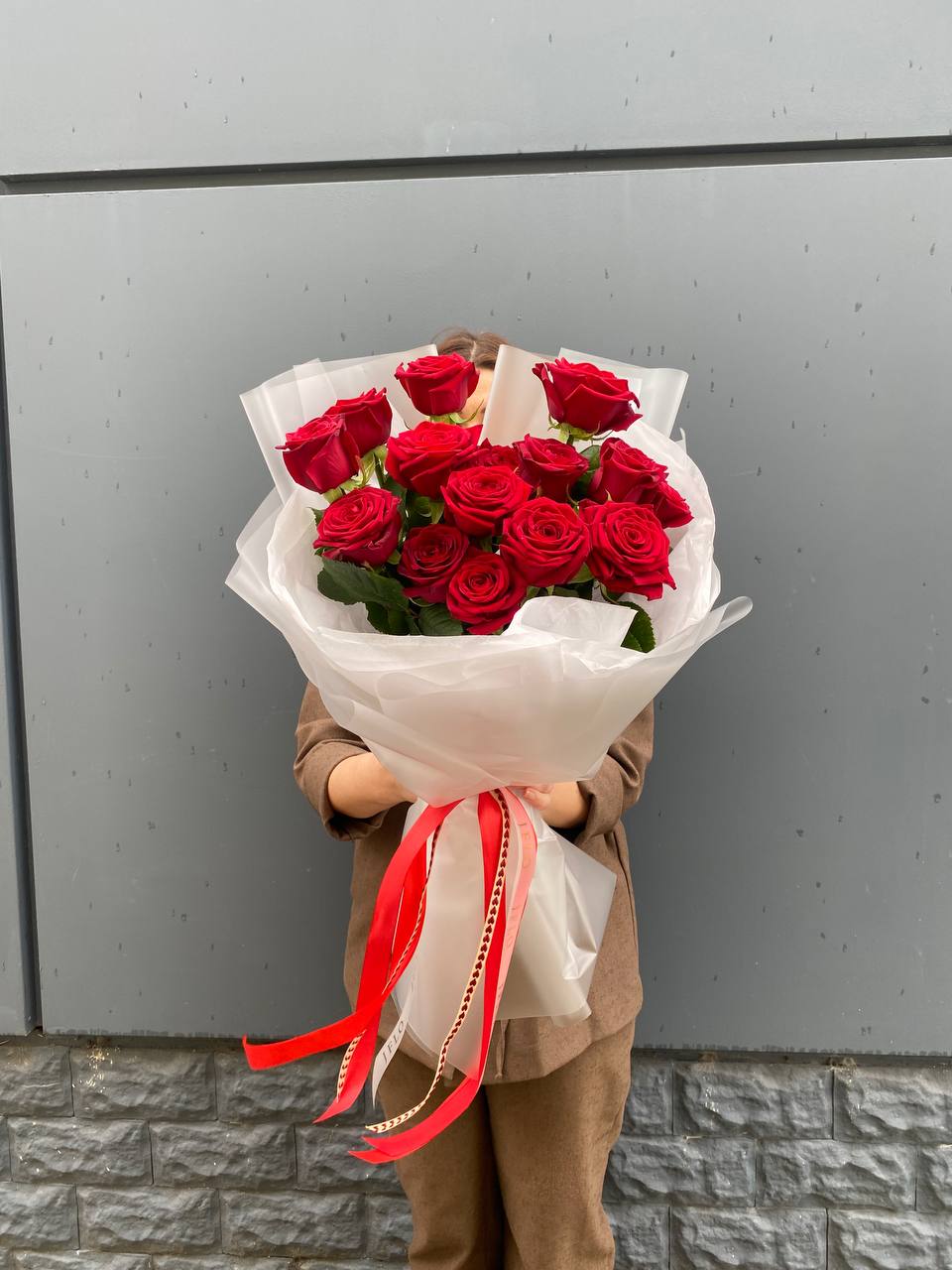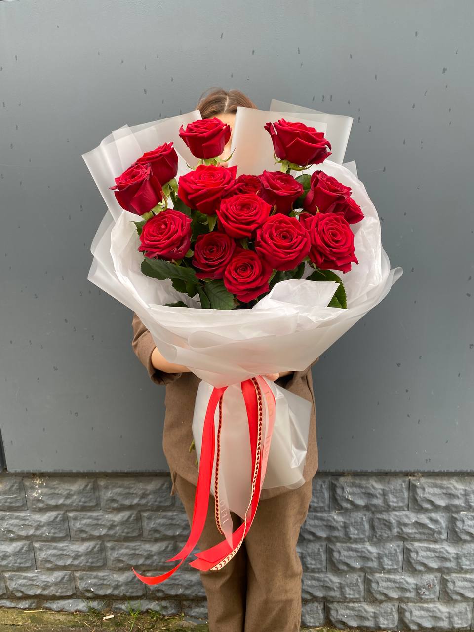 Семнадцать красных роз в обрамлении крафта или дизайнерской пленки — это лаконичная форма с выраженным характером. Букет удобен для вручения и долго радует свежестью.