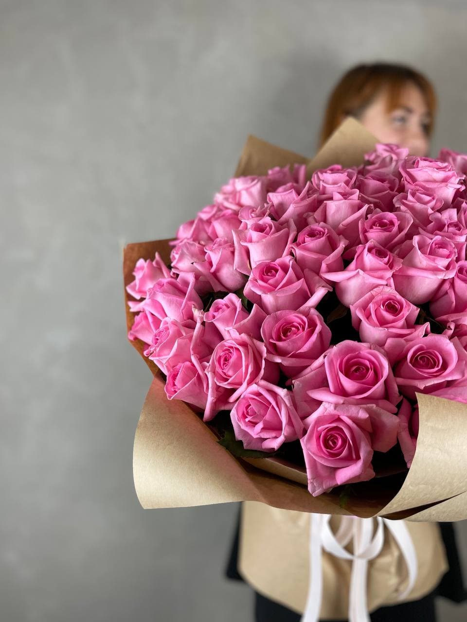 Сто одна роза в мягком розовом оттенке образует плотный объёмный букет. Бутоны раскрыты равномерно и создают впечатление цветочного облака в руках.