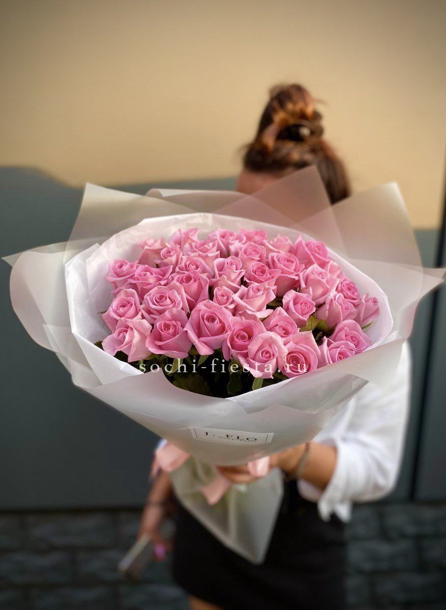 Розовые бутоны собраны в воздушную композицию с комбинированной упаковкой. Тишью добавляет фактурности, а количество цветов можно выбрать под настроение момента и масштаб события.