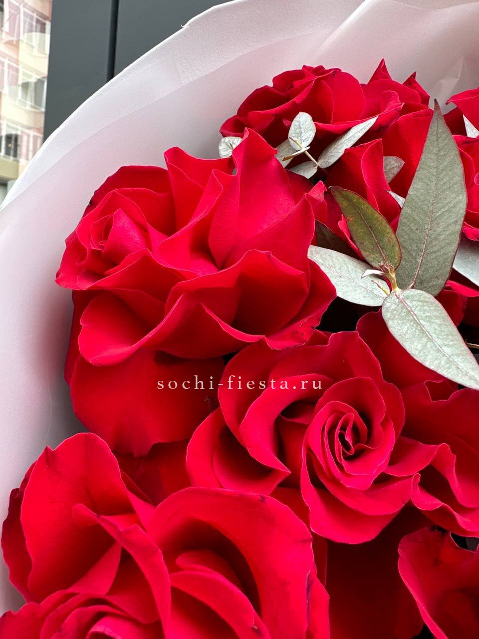 Вывернутые бутоны французских роз раскрывают слои лепестков с текстурной глубиной. Эвкалипт добавляет воздушности, а авторская упаковка завершает композицию.