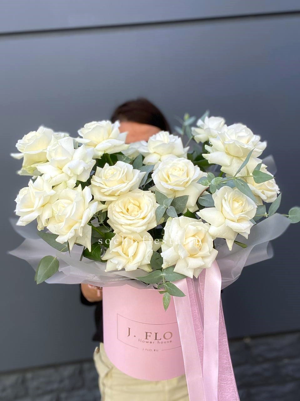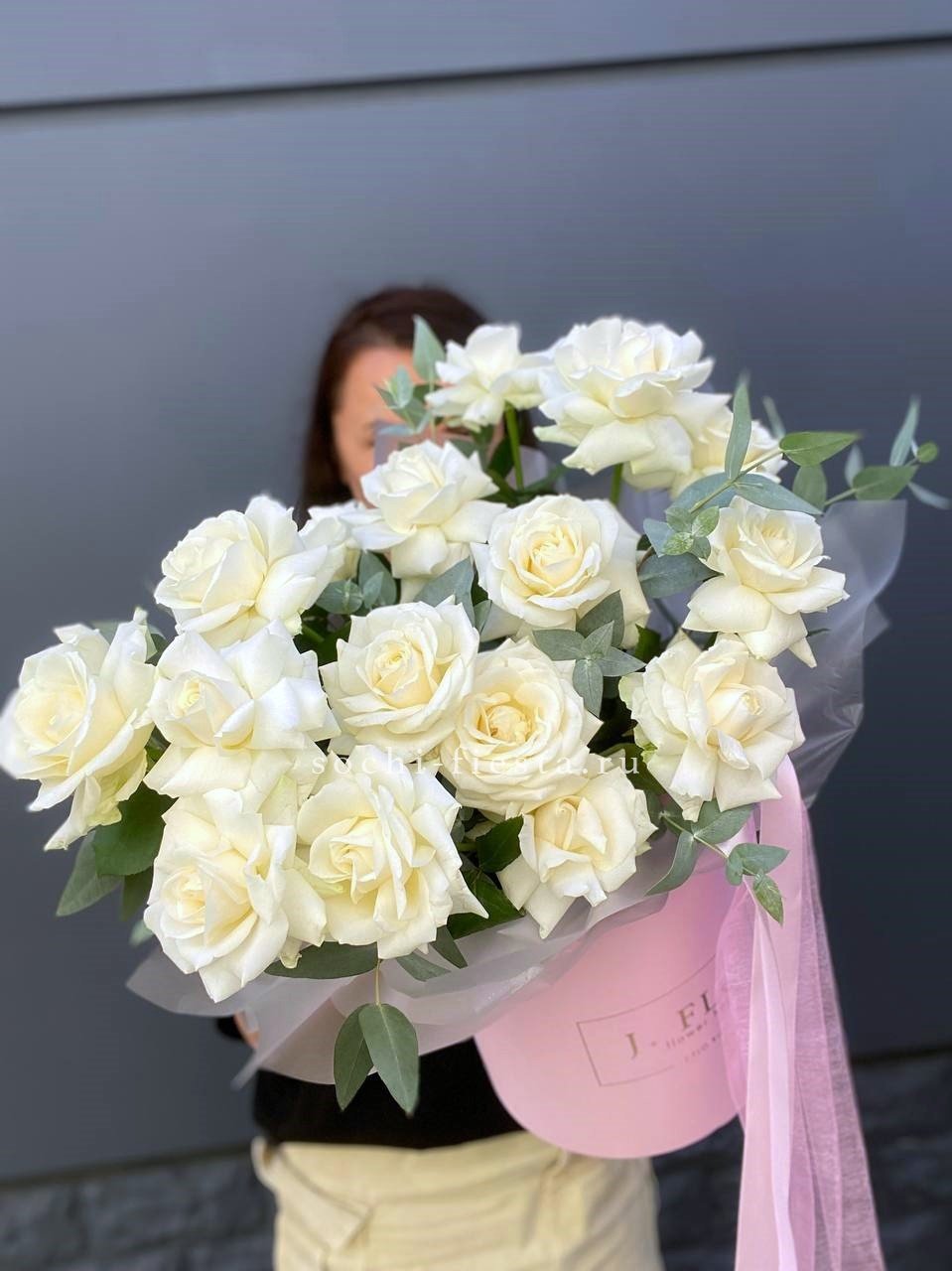 Семь вывернутых бутонов раскрываются широко и свободно, открывая слои белоснежных лепестков. Эвкалипт добавляет воздух и свежесть композиции.
