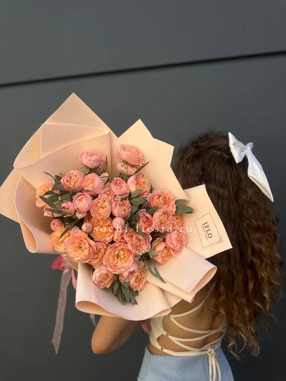 яркий букет из 11 пионовидных кустовых роз с эвкалиптом.