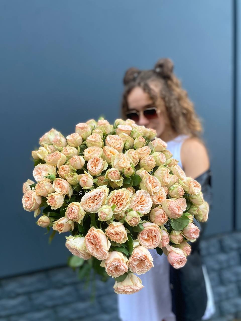 Двадцать пять пышных пионовидных роз собраны в плотный купол, где каждый бутон раскрывается слоями густых лепестков. Объёмная композиция заполняет пространство живой текстурой и создаёт ощущение abundance.