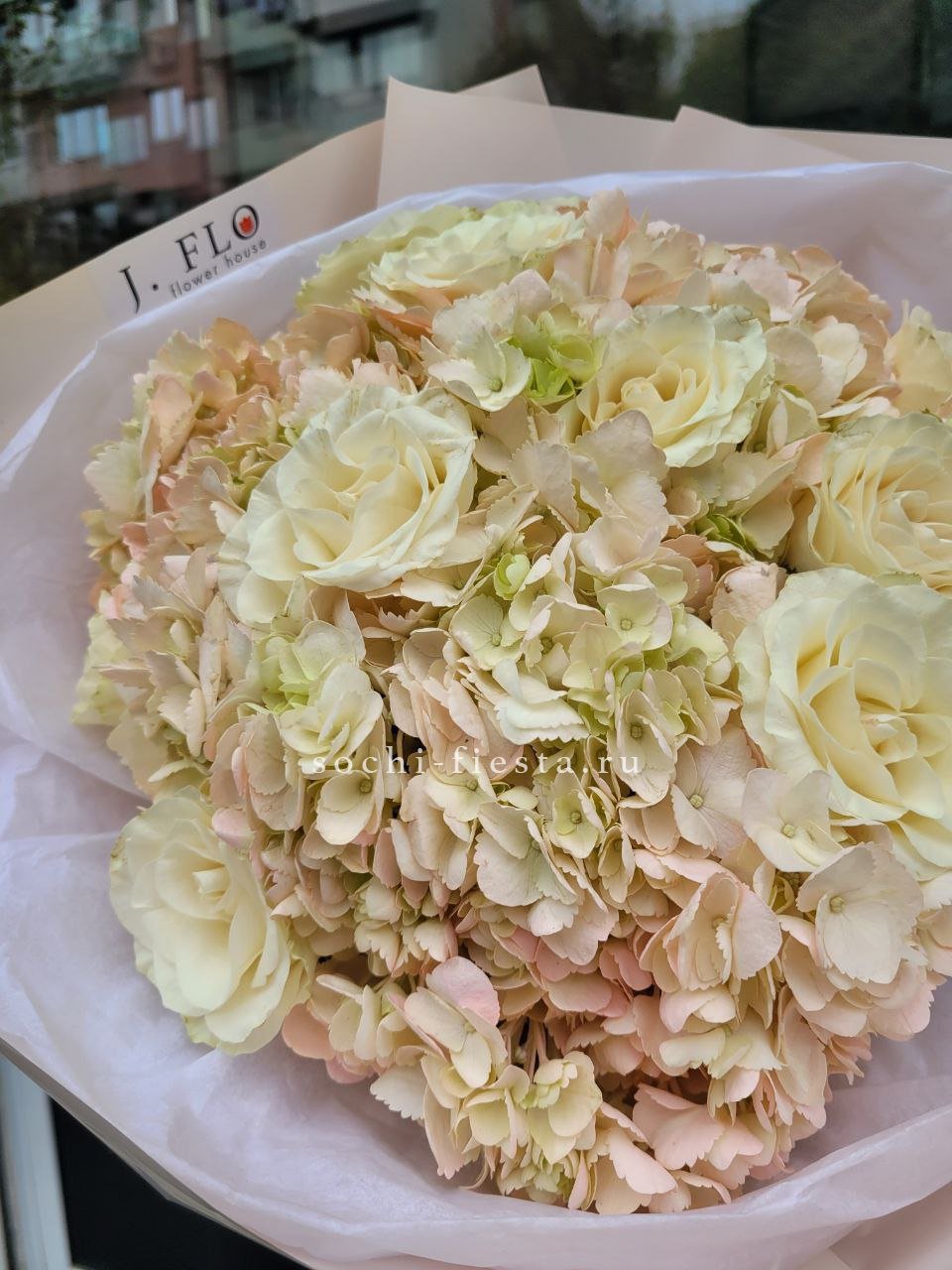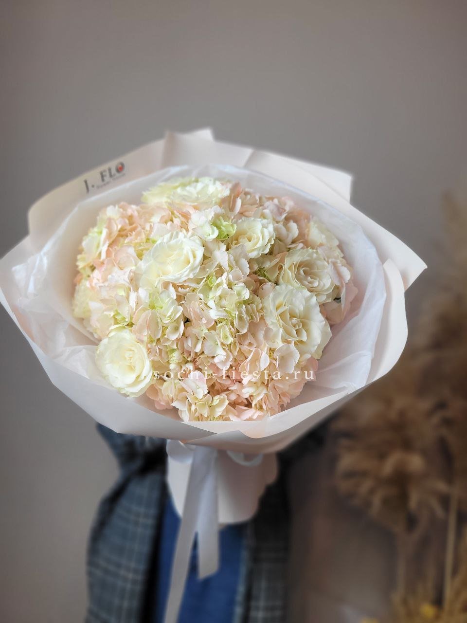 гортензия, розы джумилия, бомбастик, альстромерия, маттиола, чико, авторское оформление.