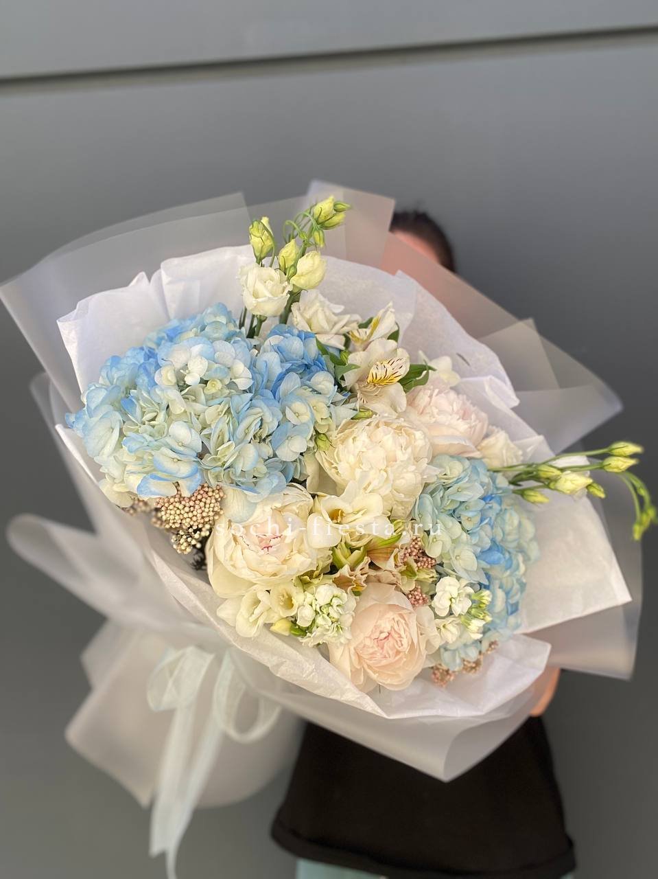 Светлая композиция собрана из пионов, гортензий и эустомы в мягкой белоснежной гамме. Воздушная форма с лёгкими переходами между соцветиями создаёт ощущение морозной свежести.