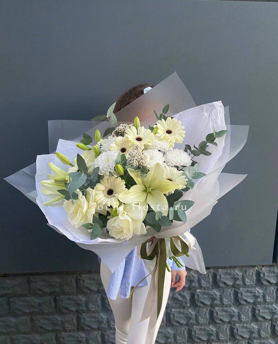 Белоснежные розы собраны в плотный круг и дополнены воздушными соцветиями кустовой хризантемы. Эвкалипт добавляет свежести и завершает композицию мягкими серебристыми оттенками. Букет держит форму и долго сохраняет безупречный вид.