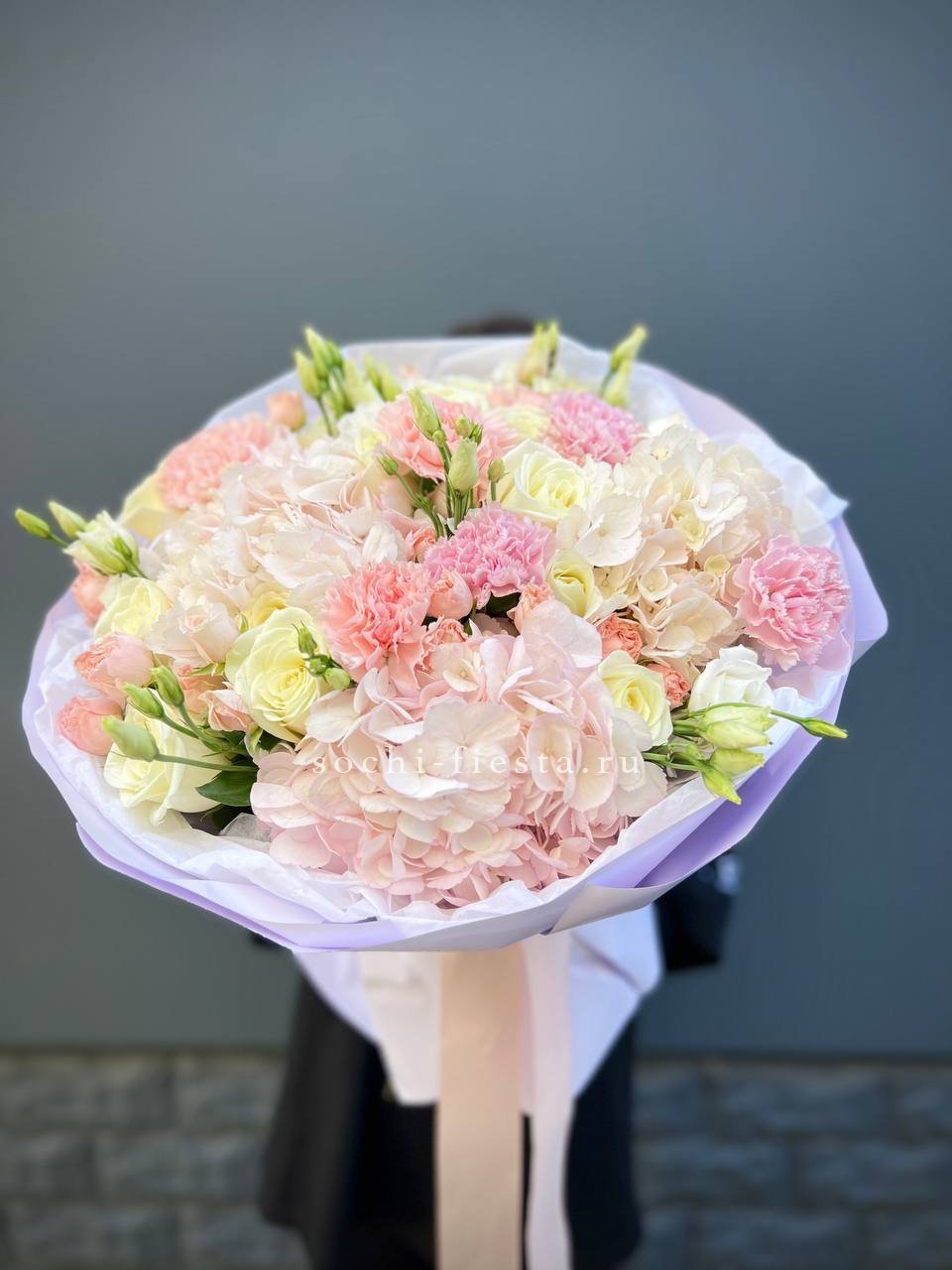 Плотные головки Мисти Бабблс раскрываются слоями и создают объёмную текстуру рядом с классическими бутонами. Белый и розовый перетекают друг в друга без резких границ. Композиция собрана в обёртку с графичным рисунком для современной подачи.