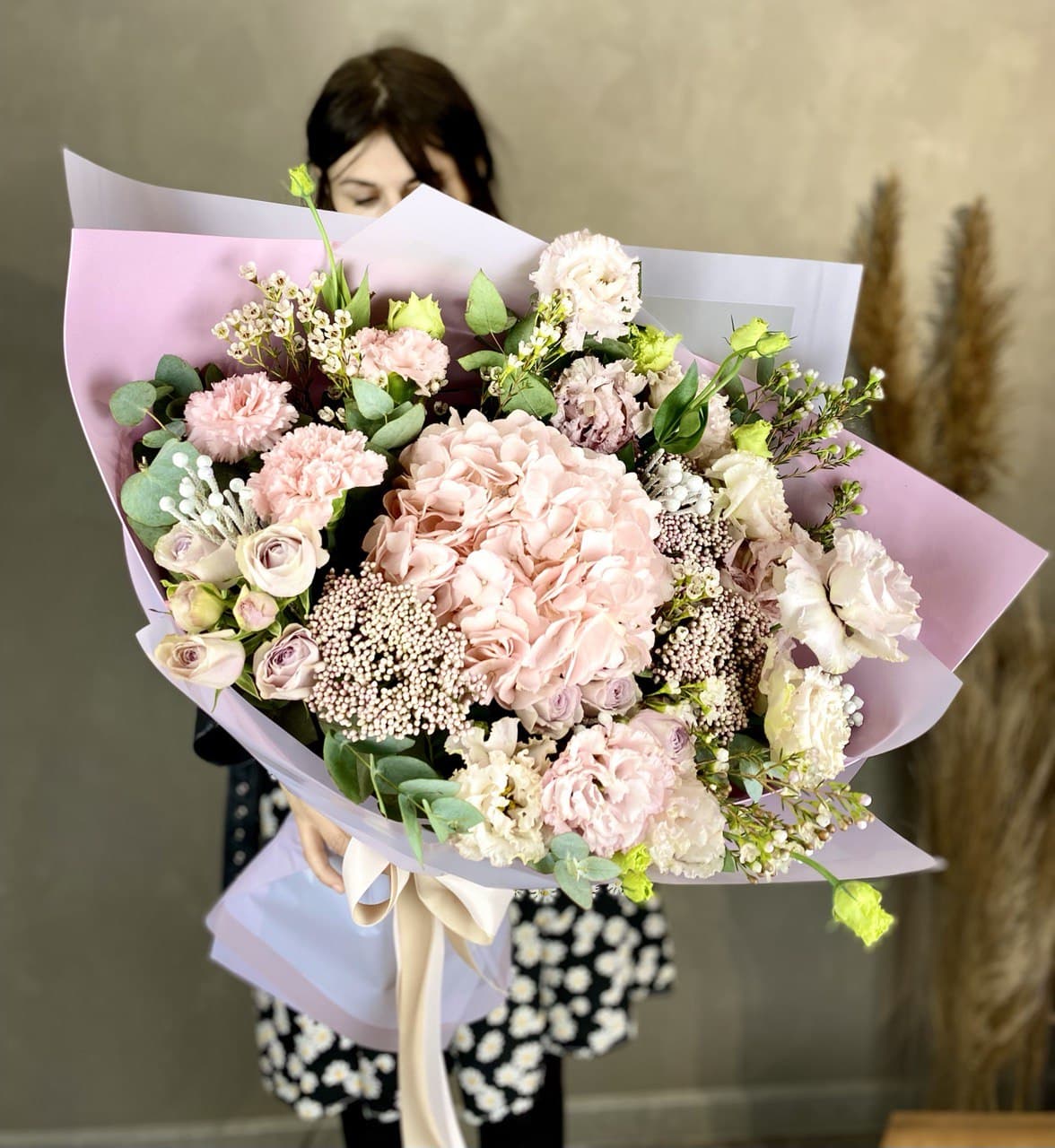 Воздушная композиция собирает кустовую хризантему, эустому и диантус в единый ритм. Озотамус и эвкалипт задают структуру, сохраняя свежесть надолго.