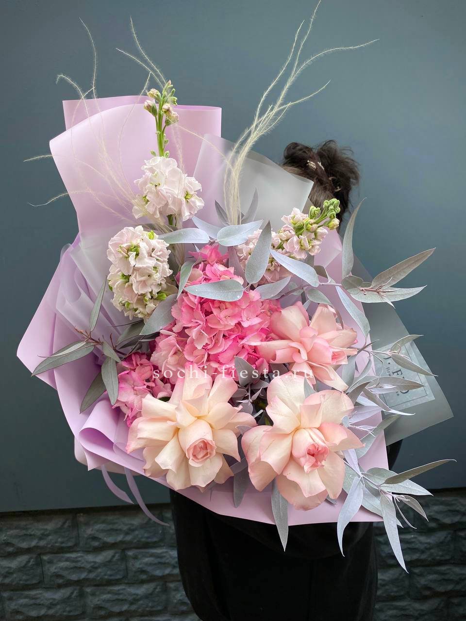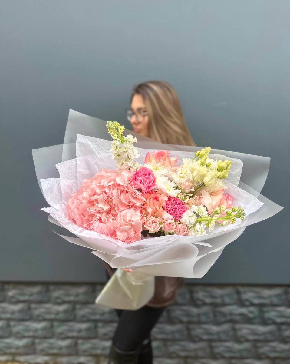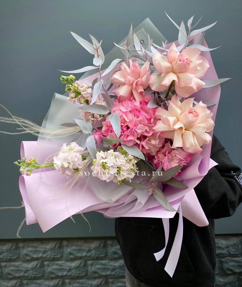 гортензия, диантус, хризантема, эустома, розы, озатамус, пленка.