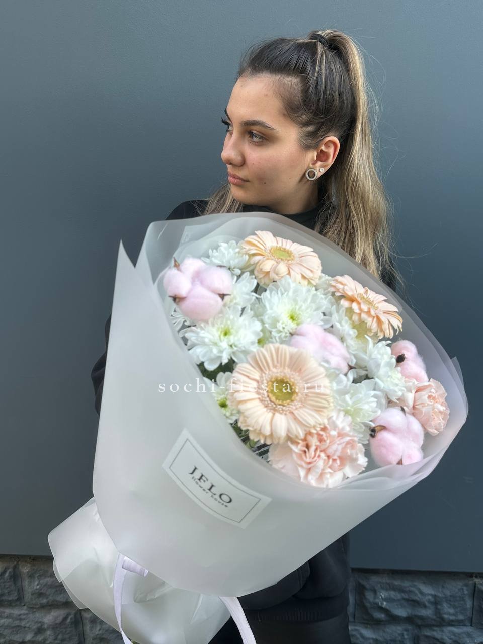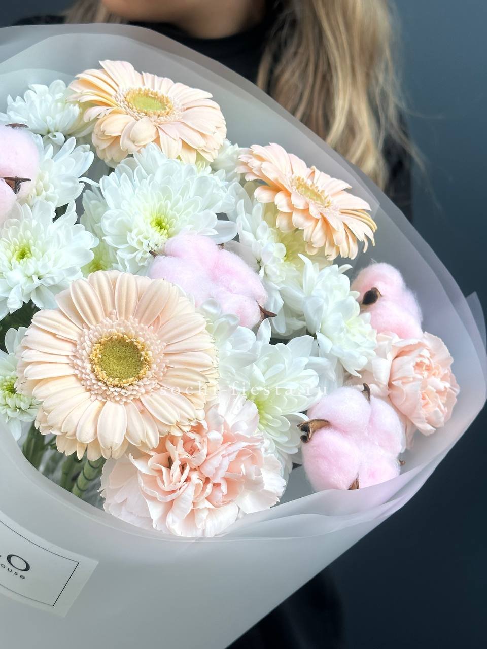 герберы, хлопок, эустома, хризантемы,  авторское оформление.