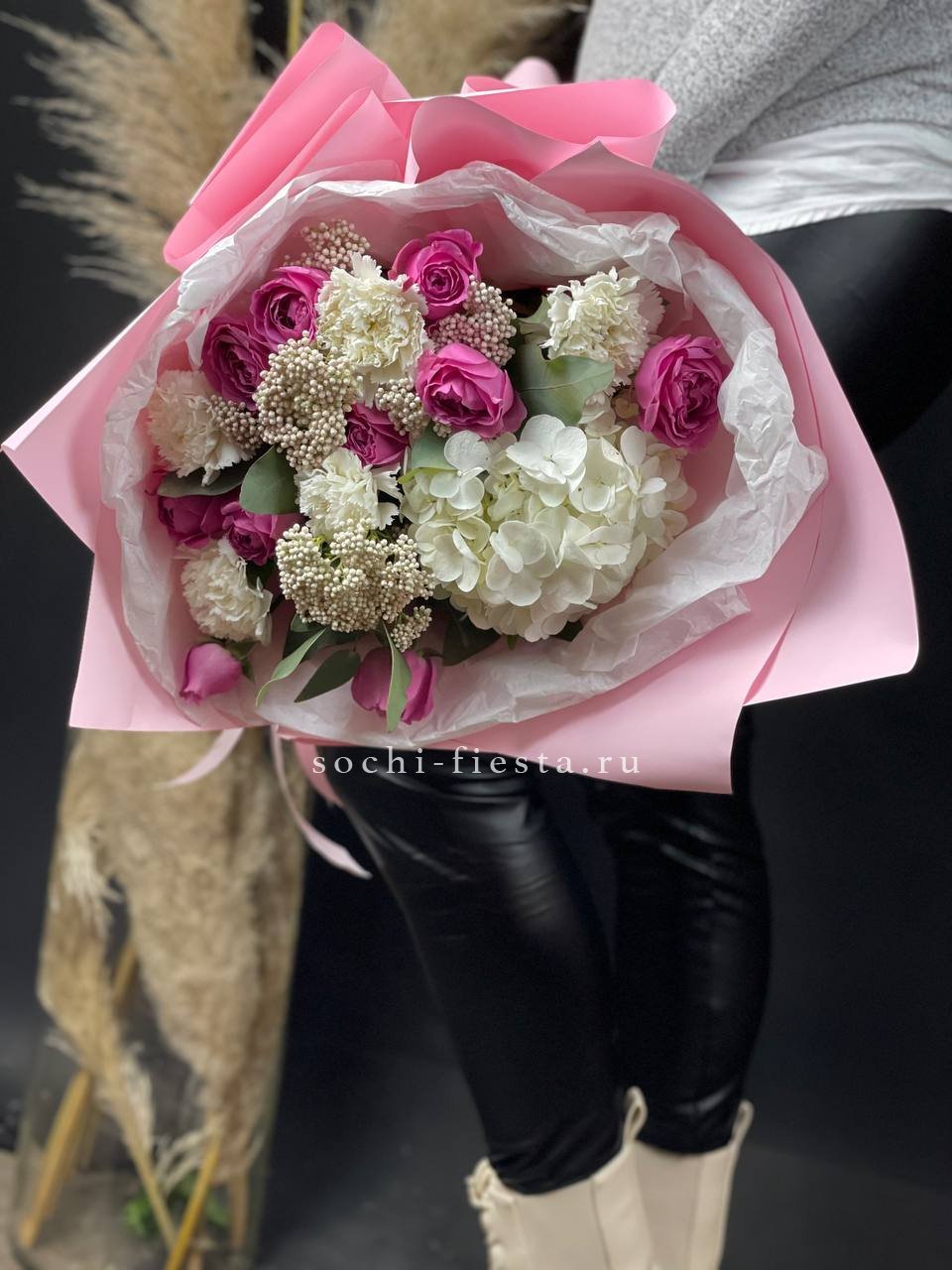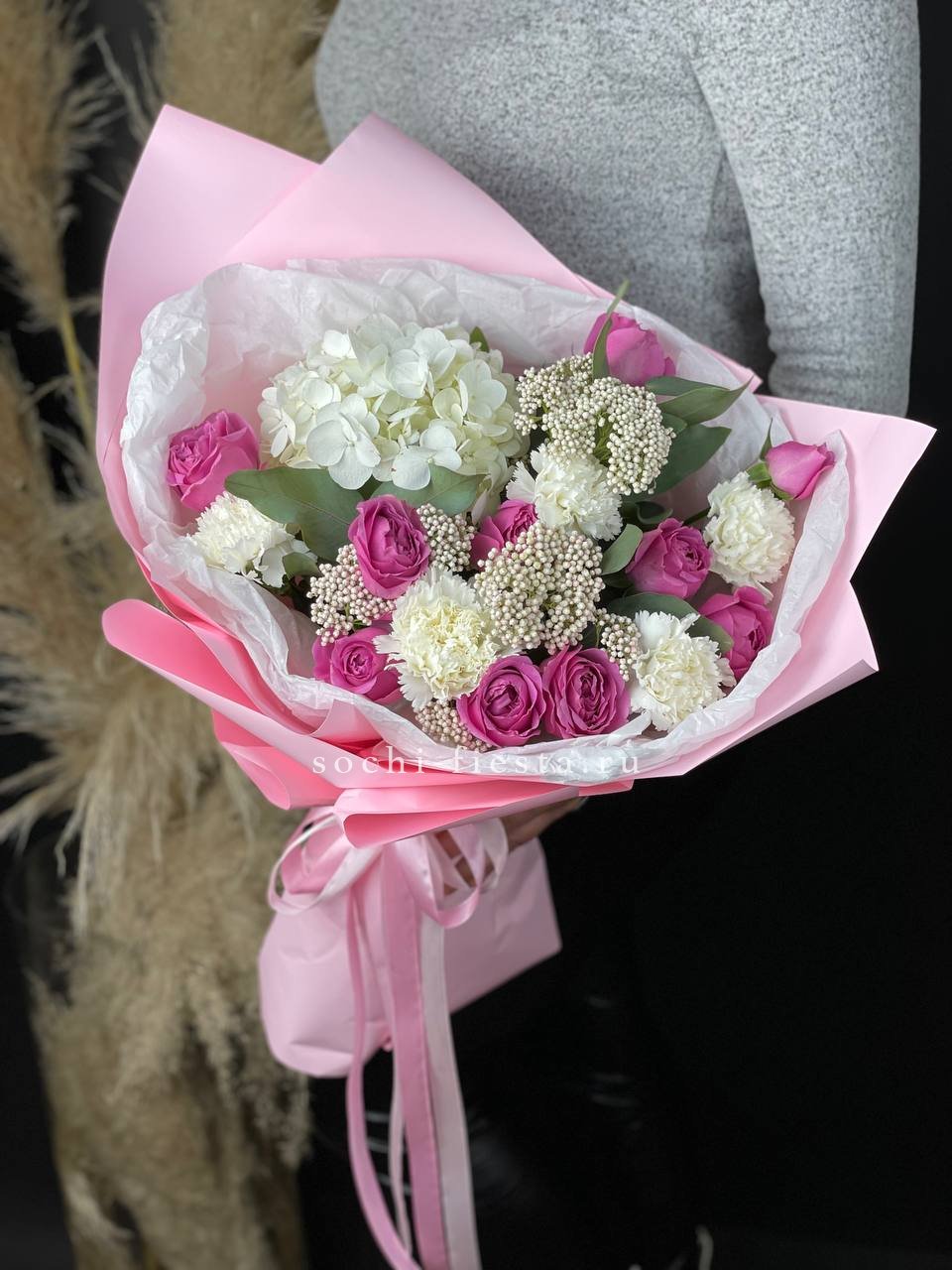 гортензия, французские розы, маттиола, лимониум, дианстусы, эвкалипт, ковыль и дизайнерская упаковка.