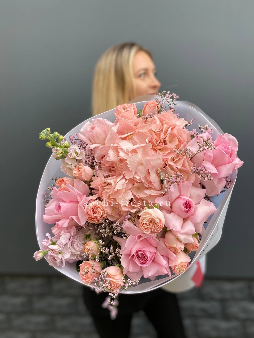 Воздушная гортензия окружена розовыми бутонами и душистой маттиолой. Лимониум добавляет букету лёгкую дымку, а общий силуэт остаётся мягким и собранным.