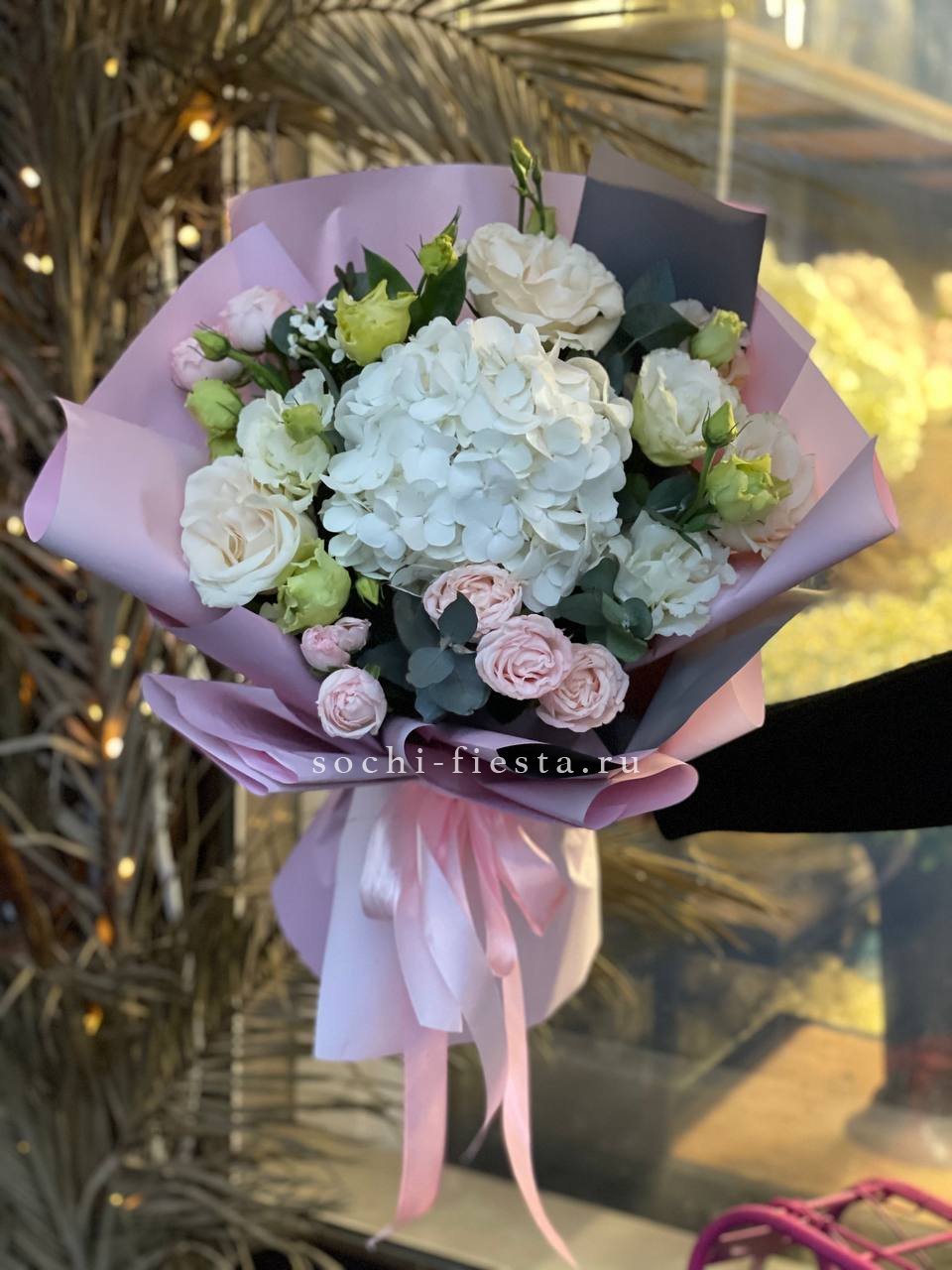 маттиола, диантусы, пионовидные розы Мисти Баблс, эвкалипт, лимониум, эустома лента, упаковка.