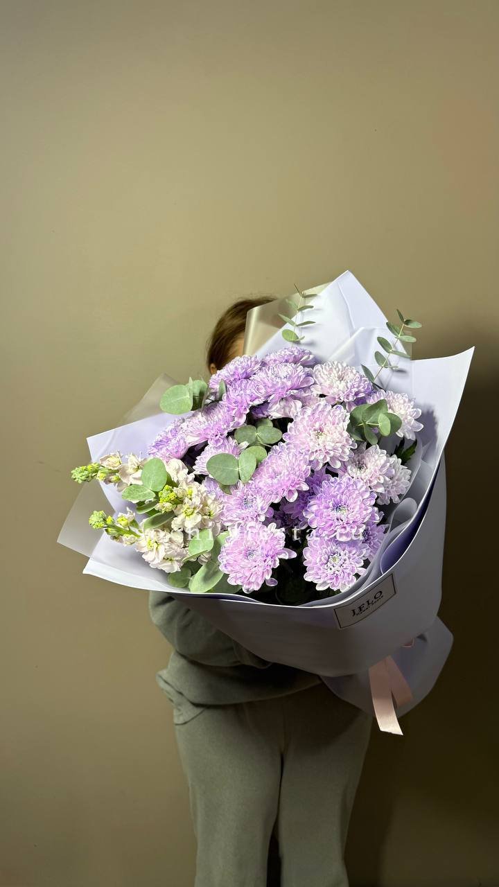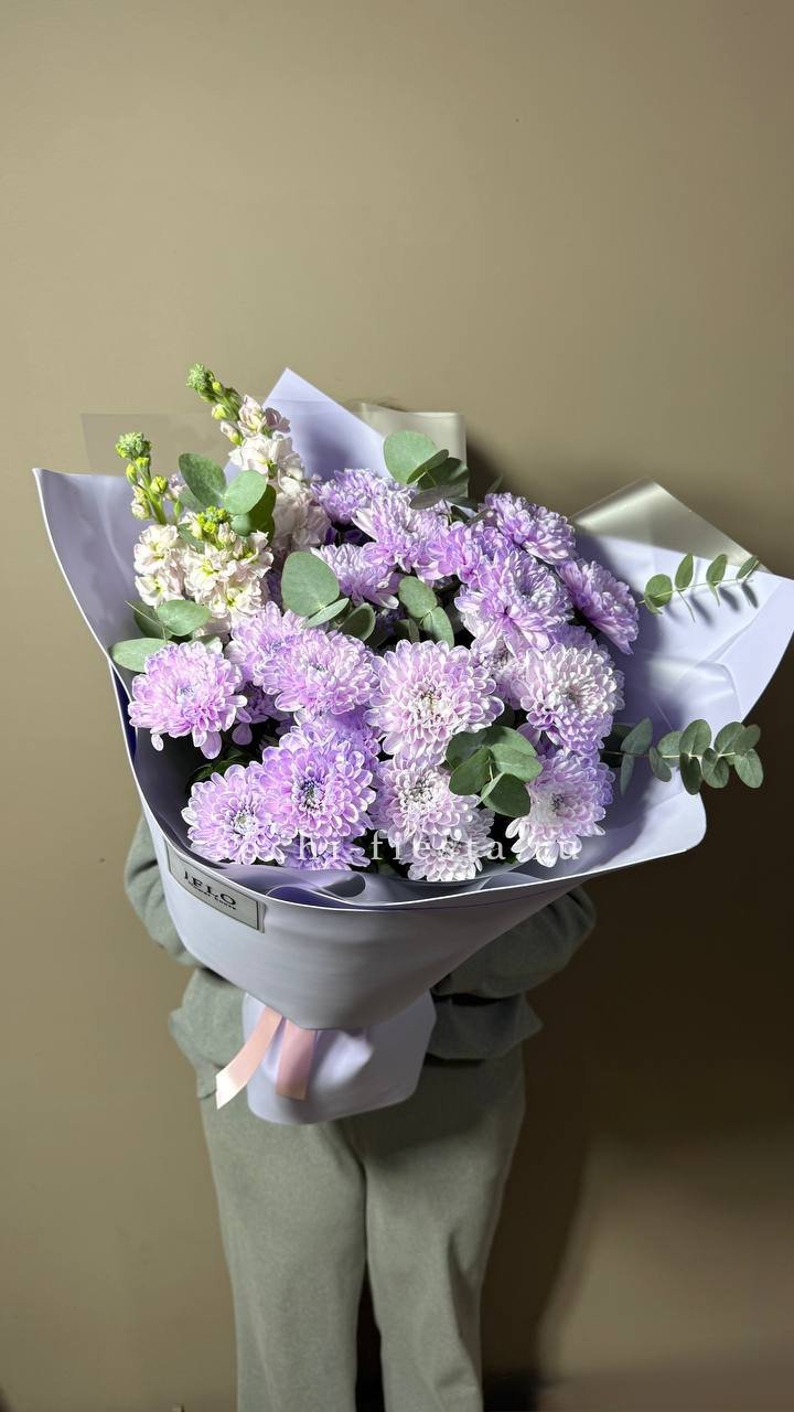Кустовая хризантема и маттиола образуют гармоничную пару с разной фактурой бутонов. Эвкалипт добавляет свежести и завершает композицию естественными линиями.