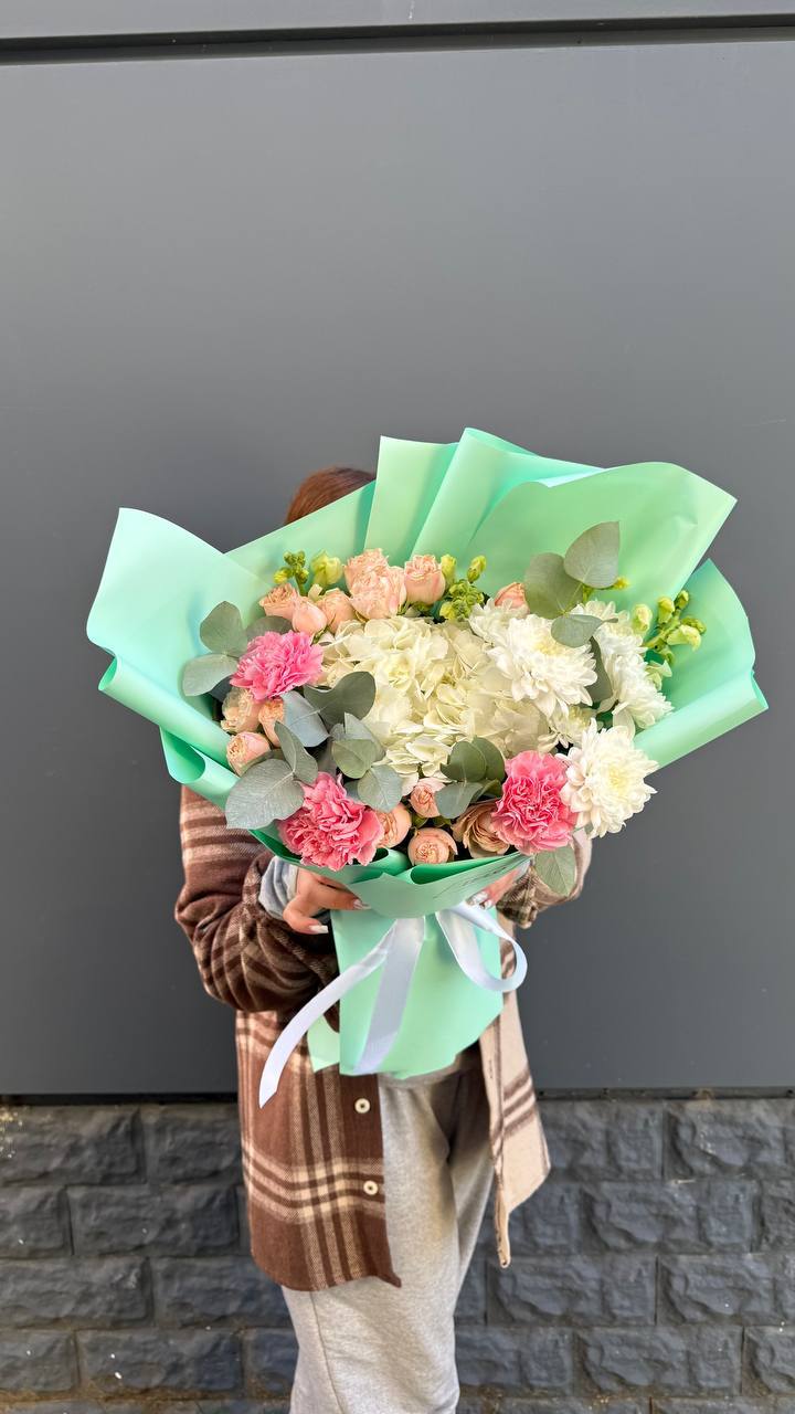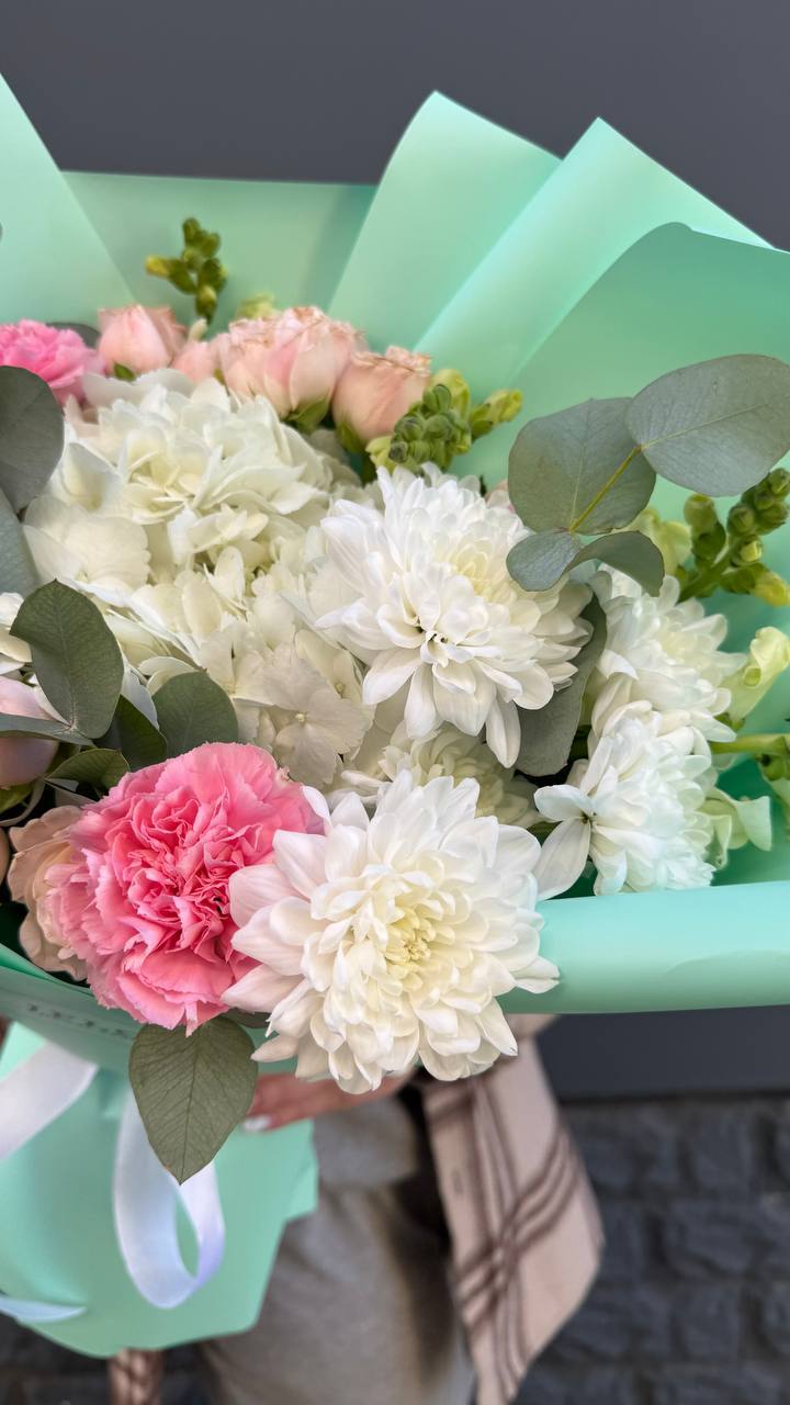 Букет объединяет хризантемы, диантусы, розы, эустому и гортензию в плотную композицию. Корейская пленка удерживает форму и создает графичный силуэт с четкими границами.
